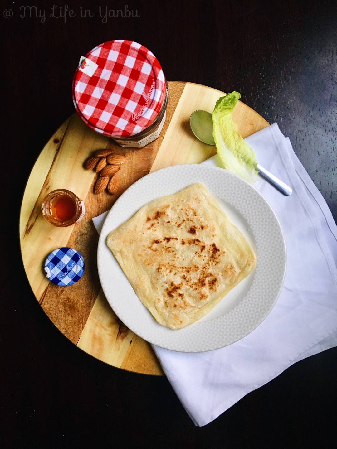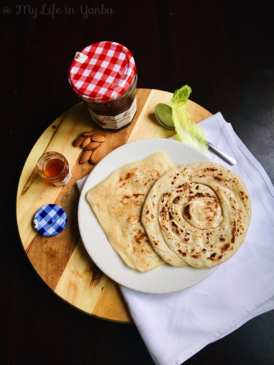 Your kneading skills will be put to test! Like I said, the ratio of flour to semolina is not standard, but the dough has to be soft, non-sticky and elastic. Coating with oil and resting the dough balls is another important step. You should be able to spread the rested dough balls easily with your hands as thin as it can get. Yes, we will use hands to spread it and no flour is used to help spread! That is a big NO! Then fold and roast on a heated heavy bottomed pan while flipping several times until it is cooked both sides. Serve hot with apricot jam, raspberry or any jam of choice, or make a syrup with honey and butter or just have with some meat curry! I have tried all these ways and could not pick a favourite.