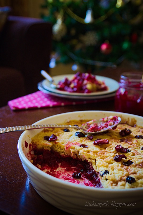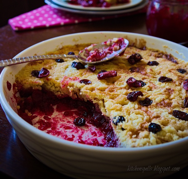I just thought of adding to the list of her recipes. I had a pudding on my mind and I was taken aback when I did a search on her blog and came up with so many of them listed already. Gosh, I was going to have a hard time coming up with some pudding not listed here. It being the Christmas season, I wanted to find a recipe that resonates with this season of celebration. A quick dessert (dessert because I am at thebigsweettooth) for Christmas celebrations was what I wanted to come up with. Now, the name of the dish may throw you off for a second. But read it again! Let me split it for you – Cobbler is nothing but the name of an English dessert that is fruit based. Cranberry happened to be my choice of fruit. Dump Cake is basically dumpling all the ingredients for a cake together. No mixing worries! I have used Cranberry sauce as the base topped with yellow cake mix which you can either make all by yourself or for ease, pick one from the store.