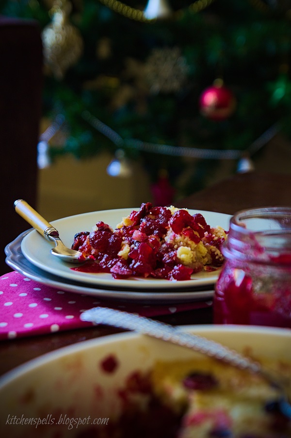 - Layer the bottom of the pan with cranberry sauce.
