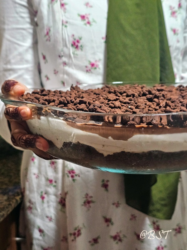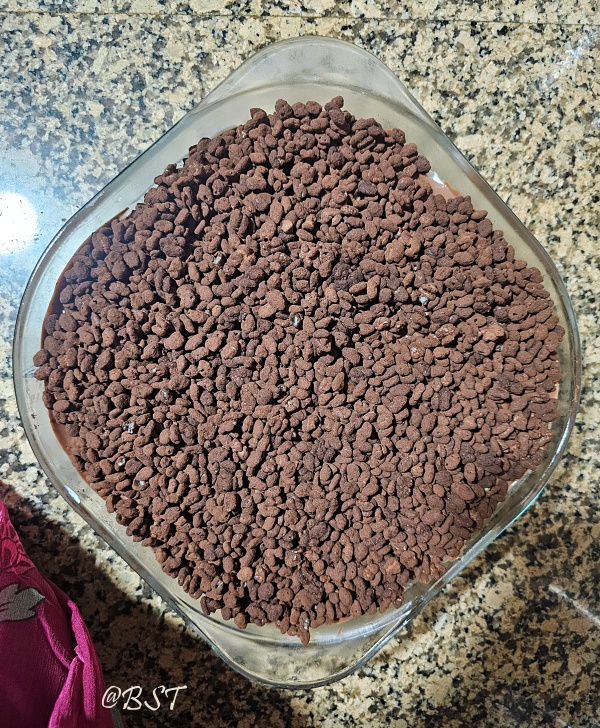 OK, so it has a chocolate cake base soaked in chocolate milk, a pudding base with whipped cream and cheese, topped with chocolate ganache and then cocoa coated chocolate rice, which gives it the “Cruncho” reference. This dessert was developed by Lazy Cat, which is a well known cafe and everybody has been coming with their own versions of it. Well, I must stay it is a good dessert to take along for a gathering. It doesn’t take time to make, if you go for store bought ingredients. It assembles in no time and does it work as it sits in the fridge. The only thing that can go wrong is with the crunchiness of the topping. It needs to be sprinkled on the top only at the time of serving so that it is crunchy. Otherwise, it will go soggy and it doesn’t taste that great – just saying.