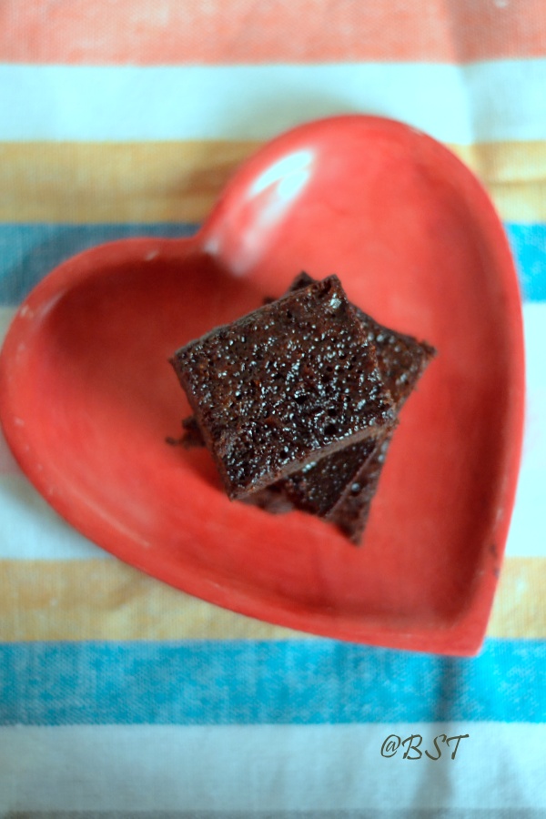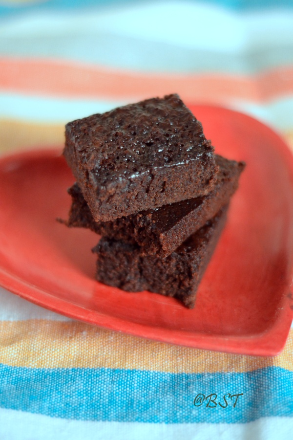 Coming to today’s recipe… My brother bought in a bottle of chocolate fudge sauce that was expiring in a couple of months. I usually don’t buy stuff like that, because we hardly use it in our routine. A bottle of Nutella, OK, but not fudge sauce… Hehe… As he got it in, I was wondering what I could do with it. Hersheys being the “baap” of chocolate syrup – though I used a local brand – I ended up searching on their website and found this link. I further found in the same link that the recipe was updated from what it used to be on the pack ages ago. I decided to try the old recipe. The only changes I made was to reduce the sugar and add a little salt. Lots of eggs, the whole bottle of syrup and just lots of gooeyness – that is how I would rate this recipe. It is soft inside, with a little caky texture. It reminded me of the sticky brownies I baked sometime ago. So if, like me, you end up with a near expiry bottle of chocolate syrup, you know what to do. 😉
