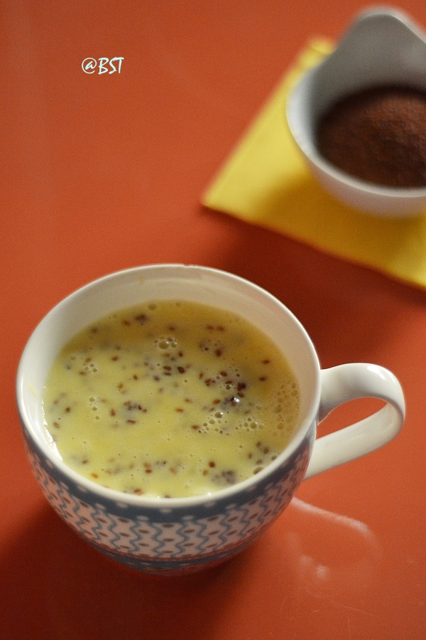 • Once the milk starts getting heated, add the soaked seeds and keep mixing, breaking the lumps and till it nicely mixes into the drink.