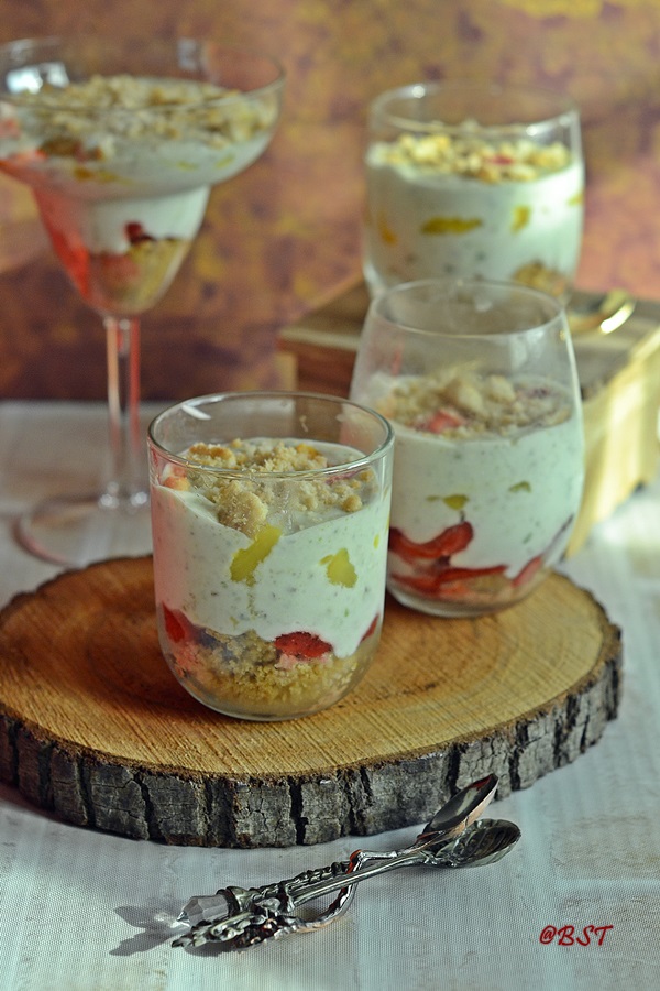 - Distribute the reserved strawberry and mango on the top as decoration. Sprinkle with crushed cookies and/or pistachios.