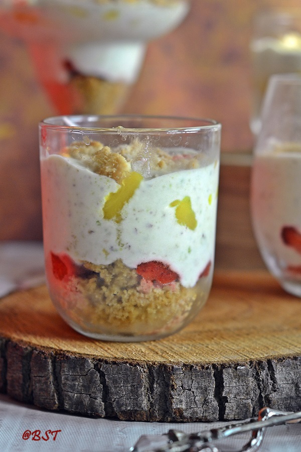 The highlight of this dessert is the pistachio cream. I sincerely wish I could find the pistachio essence we use back home for drinks, like in this milkshake. It would have elevated the flavor even further. But I have no complaints. The softly whipped cream along with the white chocolate and condensed milk played perfect fodder for the powdered pistachios. Actually, if you freeze it that mixture in a tub, it would make amazing ice cream. Just saying… 😉 The only other elements are the strawberries and mangoes. I was a little doubtful about how these fruits would go together, but then there was nothing wrong with it. I haven’t used fresh fruit, and hence both were pretty tart. Having said that, it actually went really well along with the sweet pistachio cream and the biscuit crumble. I topped it off with some crushed cookies and reserved fruit, but you can use some crushed pistachios or cashews too. The dessert was immensely photogenic, and I had a tough time choosing which ones to pick for the blog, and hence the photo intensive post. Hehe… Off to this super recipe, that deserves to be pinned! 😉