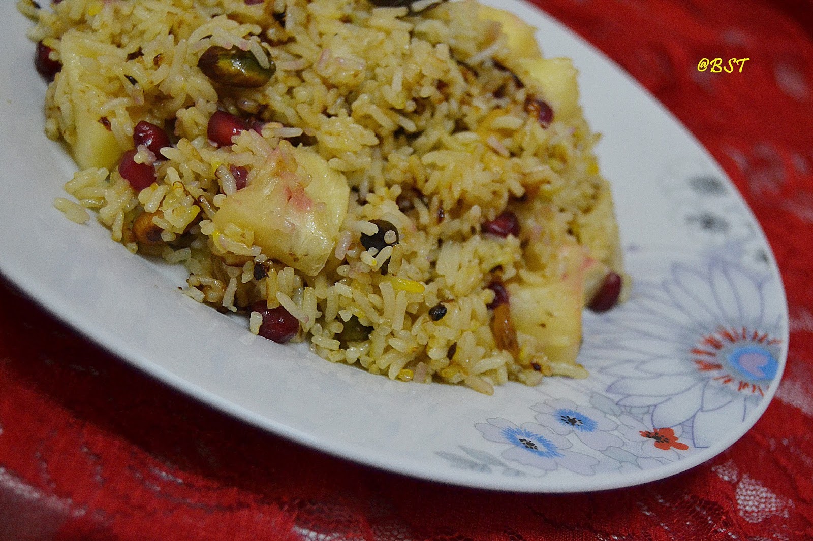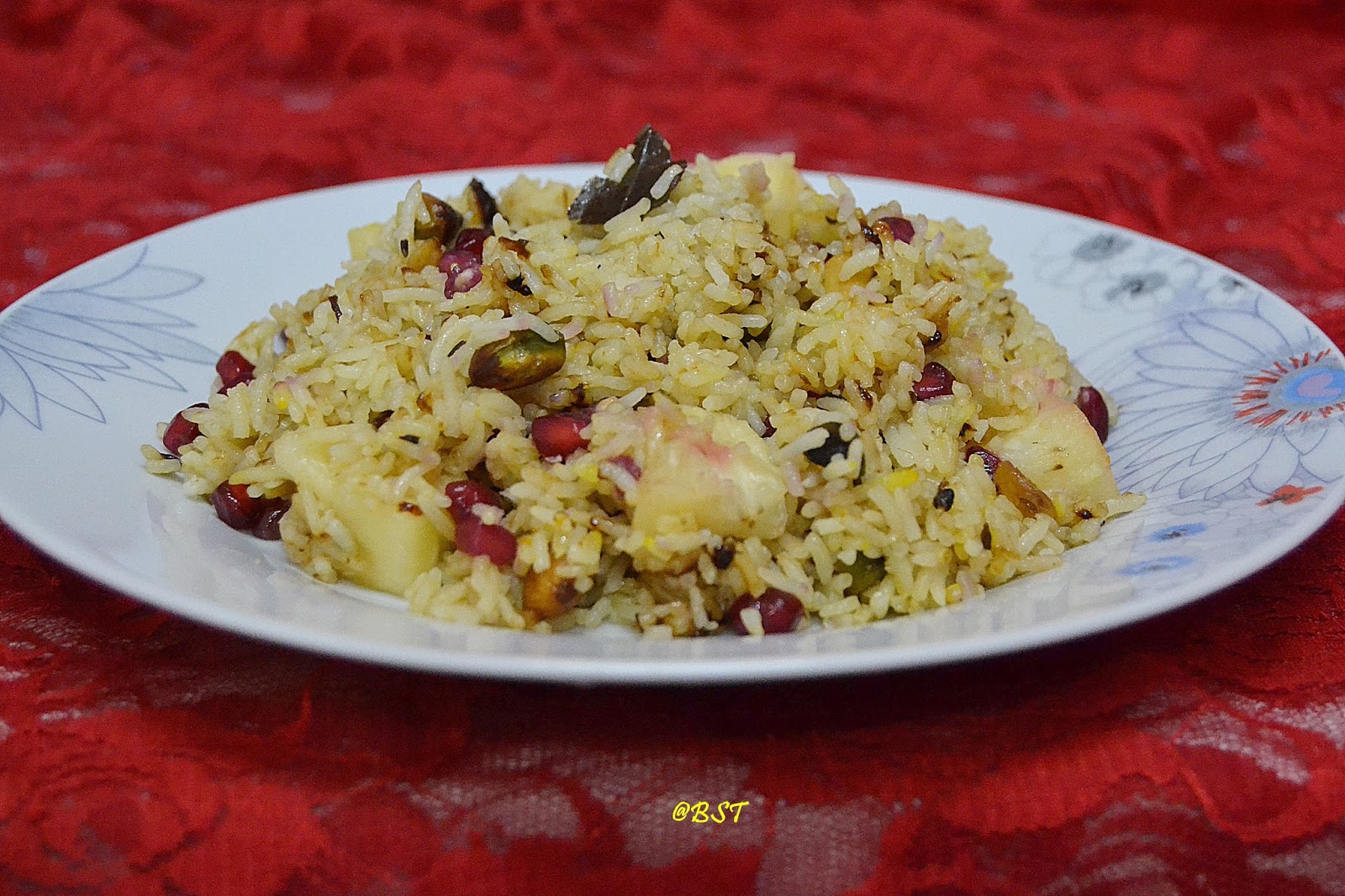 I know that feeling of missing our family during celebrations…..This reminds me of my college days…… There z a restaurant near our college and we frequently ordered Kashmiri pulao from there….. Love the combo of pulao and fruits….. 🙂