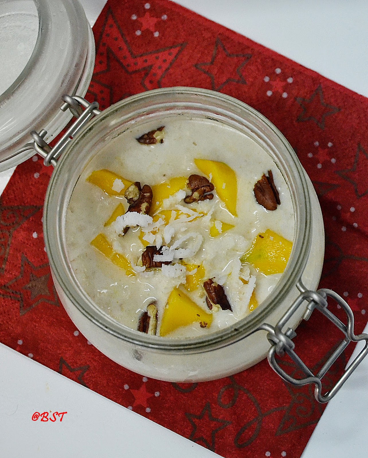 - Next day morning, top with the mango, pecans and coconut and mix well. Dig in!