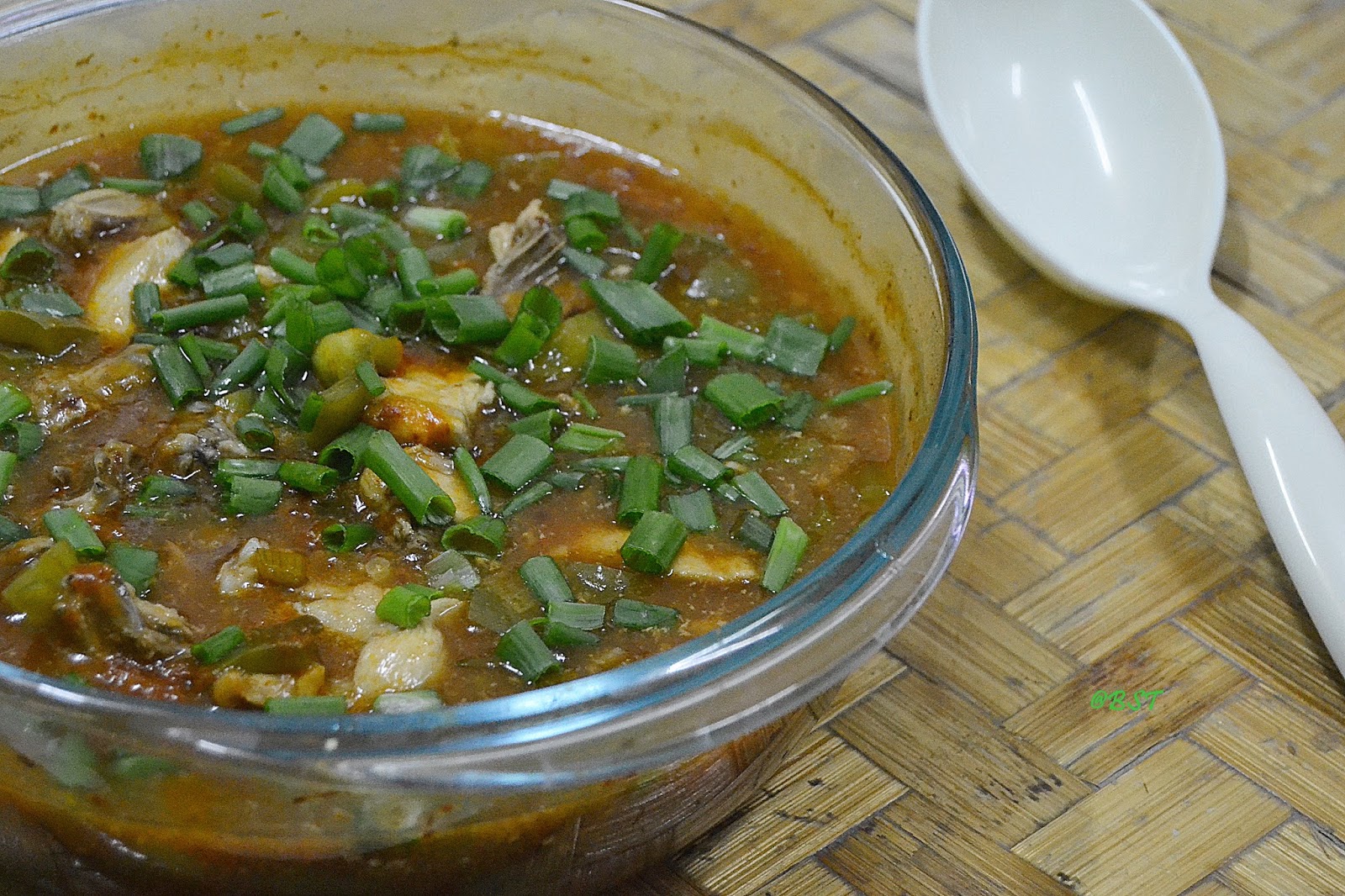 - In another bowl, combined the remaining oil, garlic, red chilli paste and white of the onion and microwave for 3 minutes.