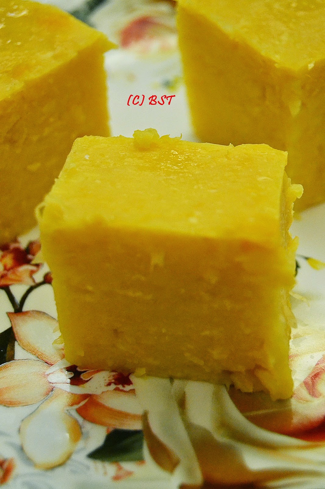 Sharing with you today a dessert which is so famous in Malaysia and other Far Eastern countries… I guess there is nobody who does not like custard. When I heard this pudding, I was so curious to know how a medley of custard powder, coconut milk and ground corn would look like and that curiousness was what pushed me to make it, though I was not 100% sure whether it would be accepted at home. My concerns were right – not everyone enjoyed the dessert, even though I loved it and I had a few pieces over a couple of days. As a savior, I sent the remaining pudding I made to HD’s colleagues and they really like it, saying that it was different – definitely, as it is not our Indian taste. 🙂 Something you can try when you crave for something different… Off to the way I made it…
