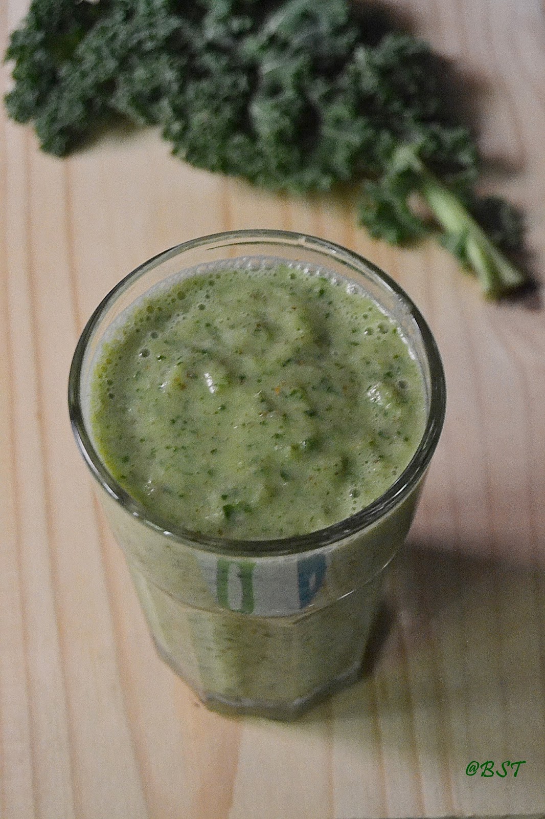 Nothing much but a simple and filling smoothie, that I had made a couple of times when I laid my hands on some kale. Nowadays, I don’t why it is becoming difficult to find good kale around. Most of the time, they are stale. Maybe I am checking out at the wrong places! Just that totally loaded smoothie that can give you the push to go ahead with zest and take on a challenging day… 🙂