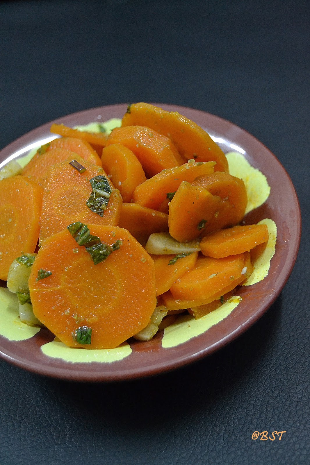 - Combine ingredients from olive oil to salt in a bowl. Add the carrot-garlic and toss well to mix. Add in the mint leaves and toss.